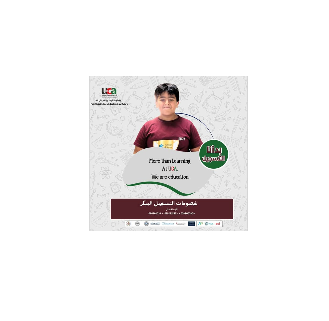 UCA offers an English-Arabic bilingual education from Kindergarten through grade 12; which prepares children for life in a rapidly changing world, along with preserving their Arab cultural heritage. Our American and British based curricula prepare students to cope with all systems; including the IGCSE and the American programs as they continue on with their secondary study. Our systems are well recognized and accepted in Jordanian and worldwide universities.
